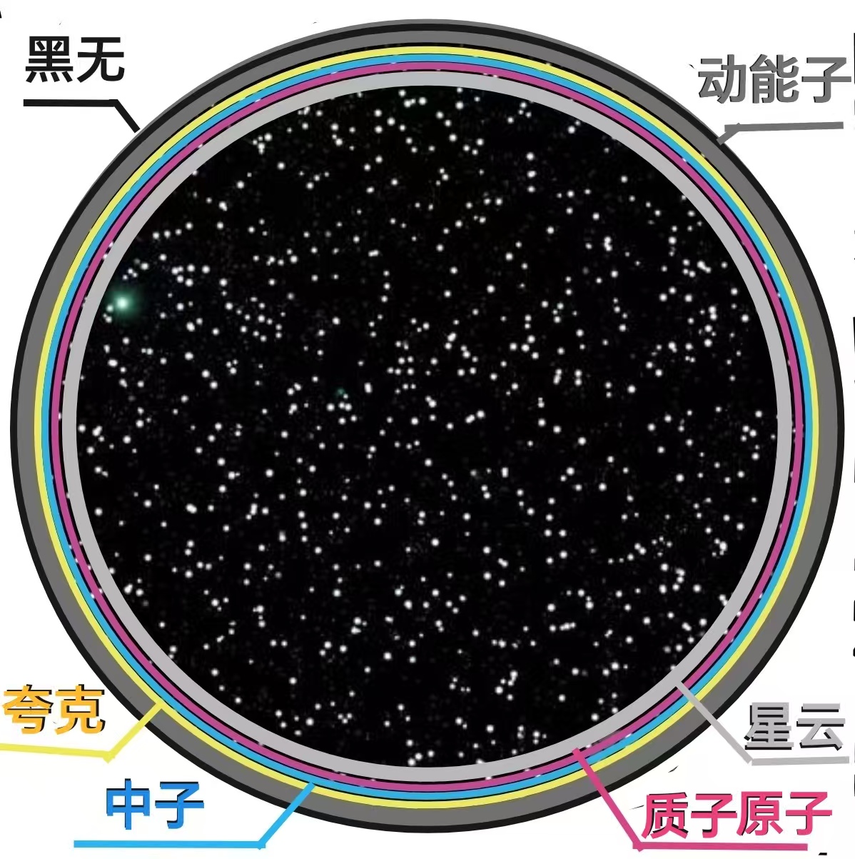 停止这个烧脑话题,回到前面讲述的宇宙最外层,均衡排列的动能子层。如果宇宙内部没有产生原子,星云和星系,整个宇宙就相当于布满了均匀的动能子,被“黑无”拉拽着。但是事实上不可能没有变化。宇宙向内的动能子,是由少到多地聚集,逐步演变成夸克、中子、质子、原子、星云、星系。这个形成过程下一章节讲解。(见图三)