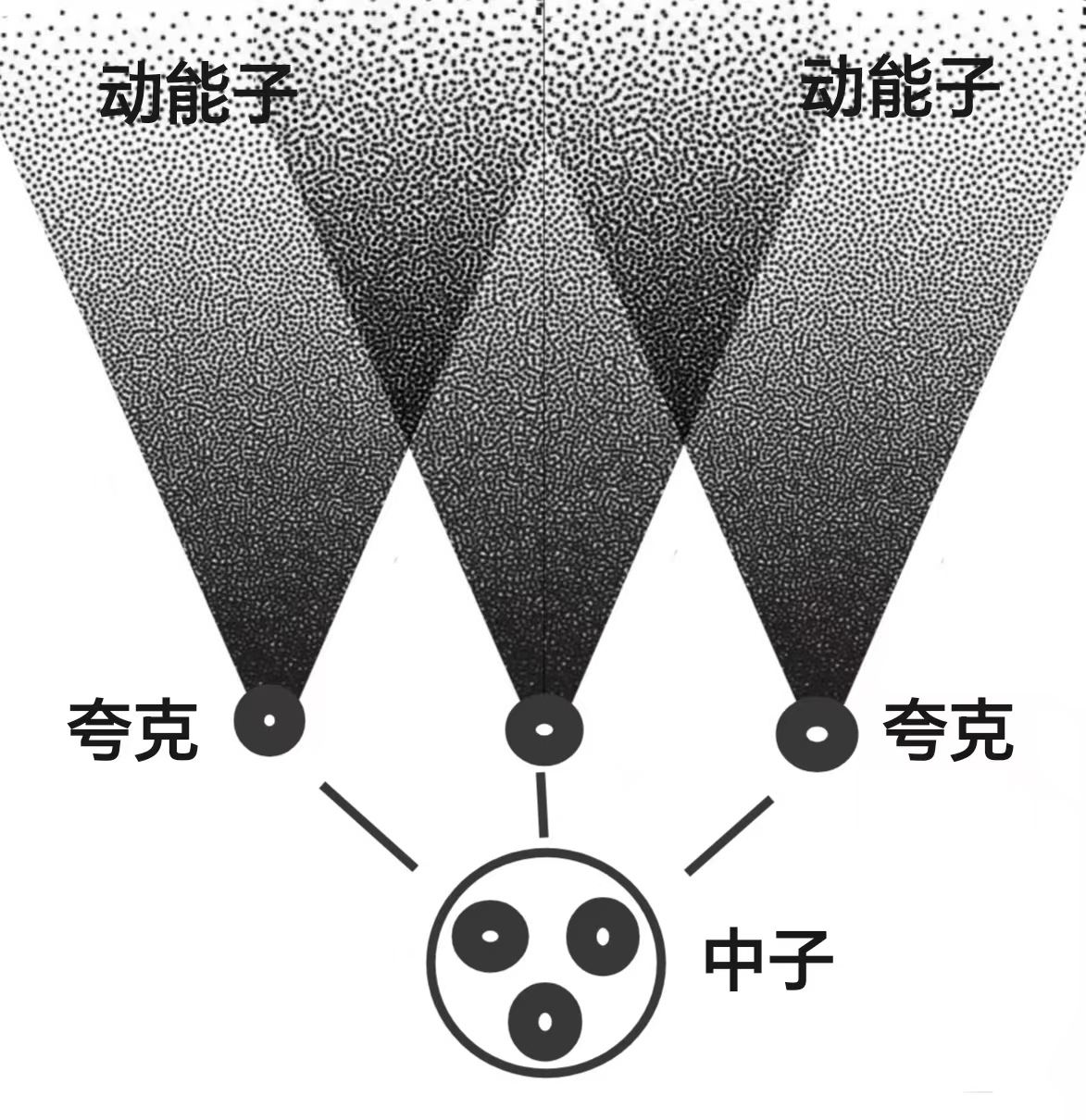 夸克是由动能子聚集形成的。动能子编织的引力网,随着向下延展的趋势,横向间隔逐渐减小,纵向间隔逐渐加大。受到下方已形成的夸克的吸引拉拽。破坏了引力均衡,导致一簇簇动能子聚集抱团。形成一个个体量相同的夸克圆球。夸克球里的动能子群,仍然保持均衡的引力结构,但是动能子相互间的距离已经缩小到极限。因此,夸克内的凝聚力也增至极大。夸克与夸克之间,起初还能保持等距离引力结构。